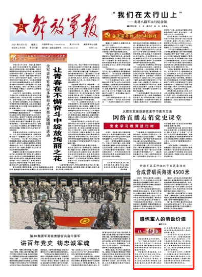 劳动最光荣,劳动最崇高。马克思说,军队不生产谷物,但生产安全。就像农民生产粮食、工人生产商品一样,军人生产安全也是一种劳动。对军人来说,积极投身火热训练场,全面提高打赢本领,成为强军先锋、备战标兵,有效捍卫国家安全、护佑人民幸福,就是劳动成果的最好展示、劳动价值的最大彰显。