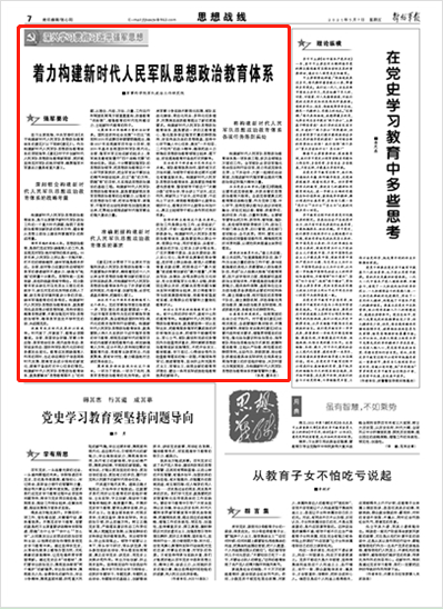构建新时代人民军队思想政治教育体系是一项系统工程,涉及各领域各方面的工作。全军部队必须自觉强化使命担当和行动自觉,努力形成党委负总责、上下齐动手、大家一起做的生动局面,为推进新时代强军事业提供可靠政治保证和强大精神力量。