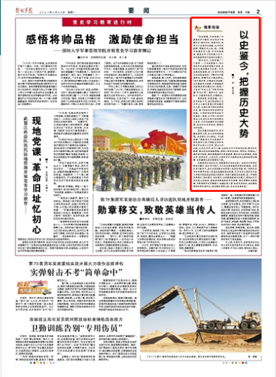 “虽有智慧,不如乘势。”开展党史学习教育,不仅是为了回顾历史、铭记历史、珍惜历史,更是为了总结历史经验、认识历史规律、掌握历史主动,进一步提升把握历史大势、应对风险挑战、推进实际工作的能力水平,加快提高新时代备战打仗能力。