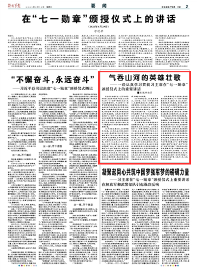 历史将永远铭记这一庄严而神圣的时刻:在庆祝中国共产党成立100周年之际,“七一勋章”颁授仪式在人民大会堂隆重举行。习主席向“七一勋章”获得者颁授勋章并发表重要讲话,全面总结了我们党的百年历程,高度赞扬了功勋模范党员作出的突出贡献,深刻诠释了他们身上体现的高尚品质和崇高精神。这是我们党首次评选颁授“七一勋章”,充分体现了党中央对功勋模范党员的高度重视和真情关爱,必将激励全党全军坚定理想信念、坚定奋斗意志、坚定恒心韧劲,进一步凝聚起同心共筑中国梦强军梦的磅礴力量。