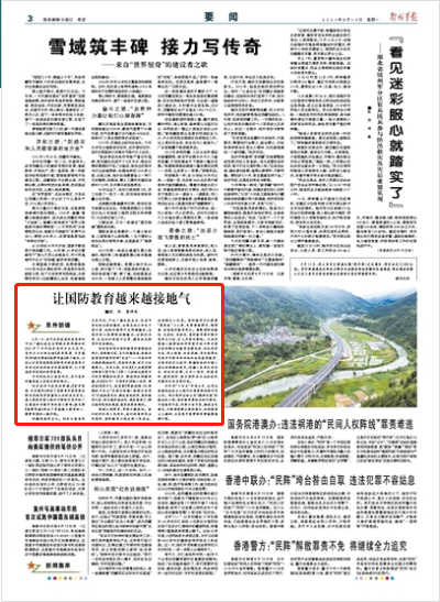 今年是“十四五”开局之年,也是全面建设社会主义现代化国家新征程开启之年。作为筑牢全体公民“精神长城”的基础性工程,国防教育要贴近时代要求,丰富教育内容,创新方法手段,推进全民普及,不断增强群众国防意识,弘扬爱国主义精神,为实现中国梦强军梦凝聚磅礴力量。