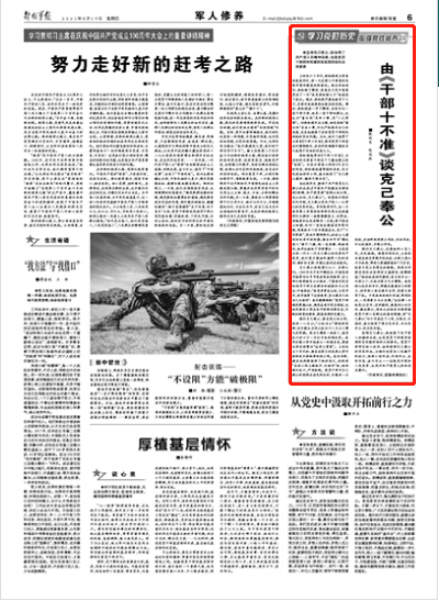 由这段历史,想到了共产党员克己奉公的品质。《中国共产党廉洁自律准则》强调,共产党员要“坚持公私分明,先公后私,克己奉公”。回望我们党的百年历程,克己奉公是共产党人一以贯之的优良传统。革命战争年代,红一方面军第三军团供给部部长周玉成挑着部队仅剩的一担银圆翻雪山、过草地,再饿再冷也没有挪用一分钱;新中国成立初期,针对一些亲友想谋官职等问题,周恩来专门召开家庭会议,定下“十条家规”,坚决不搞特殊化;社会主义建设和改革开放时期,杨业功手书“携礼莫入”挂于门楣,他一生清廉、两袖清风,把毕生献给了导弹事业……正是因为有一代又一代克己奉公的优秀共产党员,我们党才能始终赢得人民的信任、拥护和支持,不断从胜利走向胜利。
