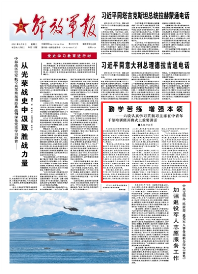 “人才自古要养成,放使干霄战风雨。”当前,人民军队正沿着中国特色强军之路,奋力实现建军一百年奋斗目标。全军官兵特别是年轻干部要坚持不懈用习近平新时代中国特色社会主义思想和习近平强军思想武装头脑,在常学常新中加强理论修养,在真学真信中坚定理想信念,在学思践悟中牢记初心使命,在细照笃行中不断修炼自我,在知行合一中主动担当作为。要发扬“挤”和“钻”的精神,多读书、读好书,从书本中汲取智慧和营养。要结合工作需要学习,做到干什么学什么、缺什么补什么。要增强本领恐慌意识,瞄准岗位职责要求,以强烈的使命担当,学习同做好本职工作相关的新知识新技能,尤其是要集中精力研究军事、研究战争、研究打仗,不断完善履职尽责必备的知识体系。要在摸爬滚打中增长才干,在层层历练中积累经验,以过硬本领展现作为、不辱使命,交出无愧于党和人民的精彩答卷。