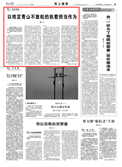 “担当使命”“敢于担当”“强烈的责任担当”……党的十九届六中全会全面总结党的百年奋斗重大成就和历史经验,既深刻揭示了“过去我们为什么能够成功”,又鲜明指出了“未来我们怎样才能继续成功”,其中很重要的一点就是,中国共产党以国家的整体利益和长远利益为旨归,具有强烈的历史担当精神。实现党在新时代的强军目标,把人民军队全面建成世界一流军队,越是在关键阶段、紧要时期,情况越是错综复杂,越会面临前所未有的挑战。就如船到中流、人到半山,此时最需要的是担当作为,最可怕的是懈怠犹疑,绝不能歇脚松劲。古往今来,凡是干出一番事业的人,必有担当之志,在实干有为中赢得胜利和荣光。以咬定青山不放松的执着担当作为,就要始终凝神聚力、激情满格,把实现远大理想同干好本职工作结合起来,积极投身工作实践,始终做到知责于心、担责于身、履责于行。面对矛盾问题,坚决破除畏首畏尾、裹足不前、退避三舍等不担当、慢担当行为,敢于“知其难为而为之”,主动担当尽责、攻坚克难,将昂扬向上的精神状态落实到担当作为的行动中。