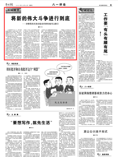党领导下的人民军队历来以敢于斗争著称于世。正是因为敢于斗争,红军才能在二万五千里长征中击退敌人的围追堵截,开启中国革命的新画卷;正是因为敢于斗争,我们才能克服各种难以想象的艰难困苦,打败了国内外异常凶恶的敌人,夺取了抗日战争、解放战争的伟大胜利;正是因为敢于斗争,我们才能创造以弱胜强、以劣势装备战胜优势装备之敌的战争奇迹,赢得抗美援朝战争伟大胜利;正是因为敢于斗争,在改革强军的征程上,人民军队以壮士断腕的精神实现自我重塑……敢于斗争始终是我党我军战胜一切艰难险阻的锐利武器。