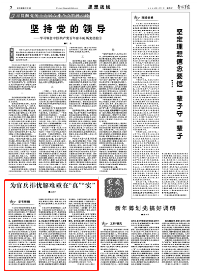 习主席在视察驻陕西部队某基地时指出,要坚持不懈抓基层打基础,满腔热忱为官兵排忧解难,把干事创业积极性充分调动起来。这一重要论述,对加强基层建设具有重要的指导意义。基层是部队全部工作和战斗力的基础。各级领导和机关只有始终关注关心基层官兵急难愁盼问题,满腔热忱为他们排忧解难,才能真正形成心往一处想、劲往一处使的干事创业氛围。