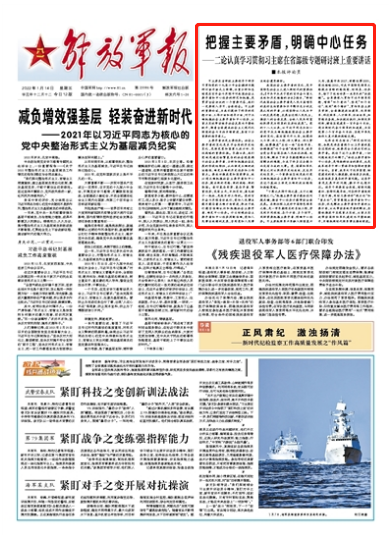 “十围之木持千钧之屋,五寸之键制阖之门。”把握主要矛盾才能抓住问题关键,推动中心任务才能带动全面发展。在新征程上走好中国特色强军之路,是一项长期艰巨的系统工程,涉及到不同领域、各个方面、多个环节,同样需要把握主要矛盾、明确中心任务。习主席把强军兴军融入强国复兴大局,谋篇布局2027,前瞻运筹2035,深远经略2050,对走中国特色强军之路提出清晰的路线图、时间表、任务书,按下了迈向世界一流军队的“快进键”。全军要深入贯彻习近平强军思想,增强“四个意识”、坚定“四个自信”、做到“两个维护”,贯彻军委主席负责制,全面推进政治建军、改革强军、科技强军、人才强军、依法治军,加紧练兵备战,加快规划执行,加强改革创新,瞄准实现建军一百年奋斗目标,跑出新时代奋斗强军的加速度,为实现第二个百年奋斗目标、实现中华民族伟大复兴提供战略支撑。