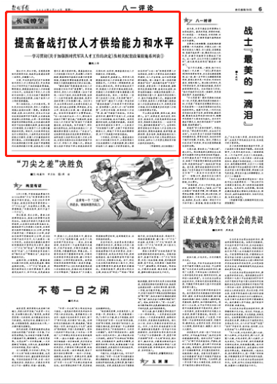 日前,中央军委印发《关于加强新时代军队人才工作的决定》,中央军委办公厅同步印发了相关配套政策措施,鲜明提出,要提高备战打仗人才供给能力和水平。这既体现了军队人才工作的目标和重心,又充分反映了推进强军兴军事业的现实需要,立起了我军人才工作的重要遵循。
