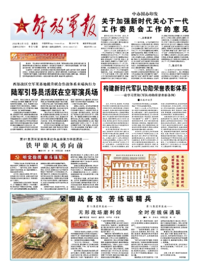 近日,中共中央、国务院、中央军委印发《军队功勋荣誉表彰条例》。《条例》对新时代军队功勋荣誉表彰工作进行系统规范,是党和国家功勋荣誉表彰制度体系的重要组成部分,是推进军事政策制度改革的重要成果。《条例》的颁布施行,对完善党和国家功勋荣誉表彰制度体系,增强军事职业吸引力和军人使命感、荣誉感,教育引导官兵发扬我军大无畏的英雄气概和英勇顽强的战斗作风,激励全军官兵奋力实现建军百年奋斗目标,具有重要意义。