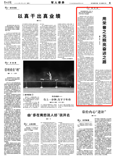 荣誉是前进路上的“加油站”,能够鼓舞士气,激励我们闯过一个个难关、迈过一道道沟坎。实践证明,崇尚荣誉的军队,才能一往无前、无坚不摧;崇尚荣誉的军人,才能中流击水、担当重任。今年,我们将迎来建军95周年,正朝着建军百年奋斗目标砥砺奋进。聚焦备战打仗,结合军事斗争准备各项任务,广泛开展新时代立功创模活动,培养树立一批谋战有功、备战有为的先进典型,持续兴起学习先进、争当先进热潮,对于实现奋斗目标意义重大。广大官兵应当树牢崇尚荣誉的价值追求,争做勇挑重担的尖兵、拓荒开路的先锋、甘于奉献的模范,立起新时代革命军人好样子,以实际行动赢得全社会尊崇,无愧于“人民子弟兵”的光荣称号,用优异成绩迎接党的二十大胜利召开。