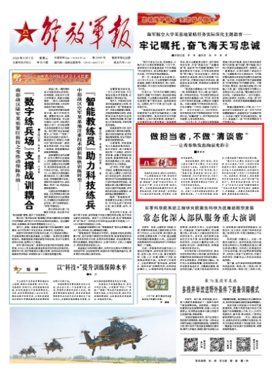 习主席提倡担当干事,寄语青年“勇做走在时代前列的奋进者、开拓者、奉献者”,告诫“不担当不作为,不仅成不了事,而且注定坏事、贻误大事”。这些重要讲话提醒青年官兵,要勇做担当者,不做“清谈客”,在军营这个大熔炉里淬炼成钢,书写绚烂、无悔的青春篇章。