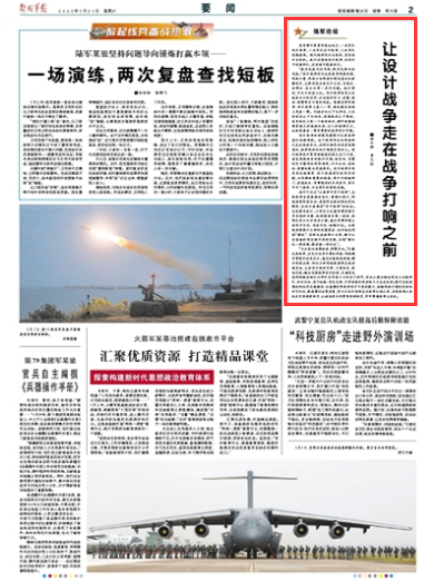 有军事专家曾形象地说过,一流军队设计战争,二流军队应对战争,三流军队尾随战争。现代战争是打出来的,更是设计出来的。我们应重视设计战争,在设计中训练部队,在训练中提高设计。