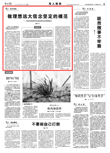 习主席在庆祝中国共产主义青年团成立100周年大会上的重要讲话中指出,追求进步,是青年最宝贵的特质,也是党和人民最殷切的希望。广大青年如何追求进步?习主席提出新时代的共青团员要做“五个模范”,认真接受政治训练、加强政治锻造、追求政治进步,为共青团员和广大青年培养发扬追求进步的宝贵特质提供了根本遵循,指明了努力方向。“军人修养”专版从今天起,以“培养发扬青年追求进步的宝贵特质”为主题推出一组文章,深入学习习主席重要讲话精神,与读者交流学习体会。