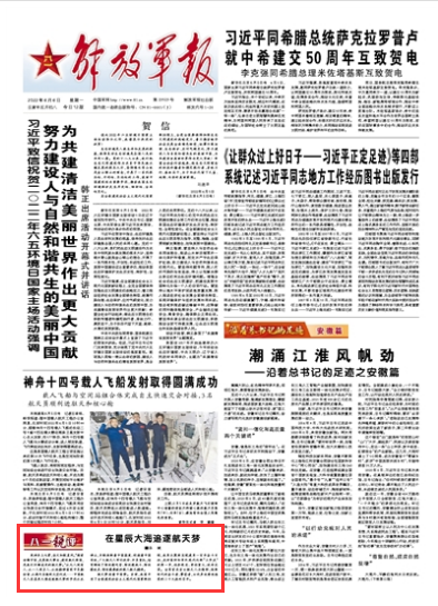 航天梦连着中国梦。当前,我国开启了全面建设社会主义现代化国家新征程,我军正聚焦实现建军一百年奋斗目标,走好国防和军队现代化新“三步走”的第一步,任务艰巨、责任重大、使命光荣。全军官兵当以航天人为榜样,做新时代的奋斗者、攀登者,以优异成绩迎接党的二十大胜利召开。