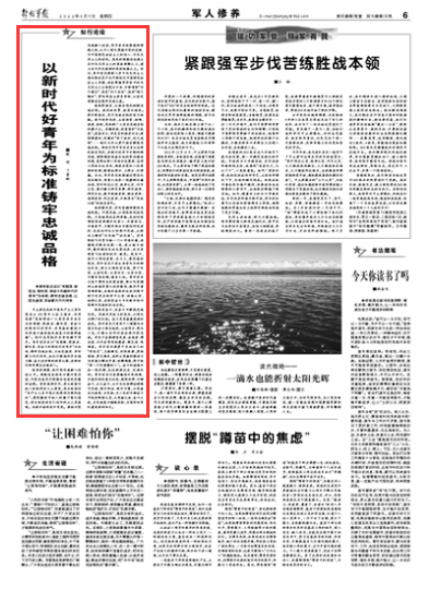 习主席在庆祝中国共产主义青年团成立100周年大会上指出,共青团要“团结带领广大团员青年成长为有理想、敢担当、能吃苦、肯奋斗的新时代好青年,用青春的能动力和创造力激荡起民族复兴的澎湃春潮”。时代总是把历史责任赋予青年。青年官兵当以“有理想、敢担当、能吃苦、肯奋斗的新时代好青年”为标准,铸牢忠诚品格,让红色基因、革命薪火代代传承,如此才能接好历史接力棒、奋力走好新的赶考之路,使新时代强军事业后继有人。