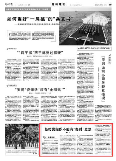 党组织坚强有力,就没有战胜不了的艰难险阻,就没有过不去的雪山草地。临时党组织作为党组织的一种重要类型,需要各级认真研究探索,进一步健全组织、规范设置、明晰职权、强化功能,切实增强领导力组织力执行力,让临时党组织充分发挥动散条件、演训一线的战斗堡垒作用,带领党员以实际行动践行初心使命,为党旗军旗增光添彩。