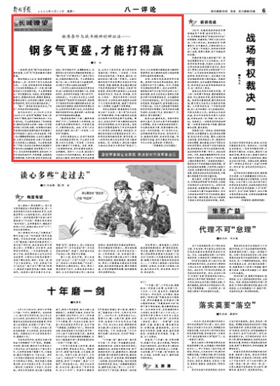 胜负之征,精神先见。实现中华民族伟大复兴,是近代以来中华民族最伟大的梦想。在由大向强迈进的征程中,不仅要在物质上强,更要在精神上强,这是一条历史铁律。对人民军队而言,这种精神筑牢的是信念,坚定的是斗志,激励的是勇敢,成就的是打赢。唯有钢多气更盛,我们才能在历史的洪流中屹立不倒、奋勇向前、不辱使命。