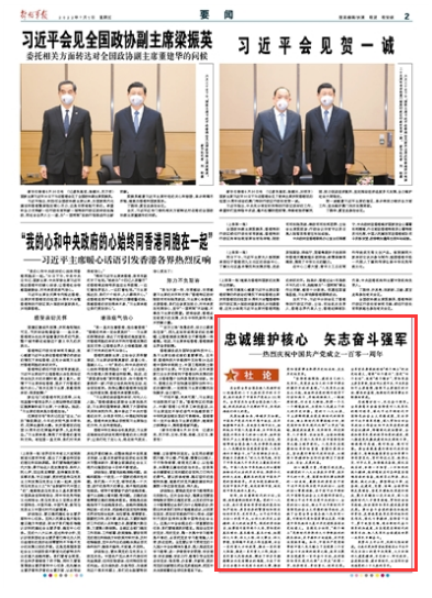 核心凝聚力量,思想引领发展。回顾党的十八大以来极不寻常、极不平凡的十年,党、国家和军队事业取得的一切成就,最根本的原因在于有习近平同志作为党中央的核心、全党的核心掌舵领航,在于有习近平新时代中国特色社会主义思想科学指引。党确立习近平同志党中央的核心、全党的核心地位,确立习近平新时代中国特色社会主义思想的指导地位,反映了全党全军全国各族人民共同心愿,对新时代党和国家事业发展、对推进中华民族伟大复兴历史进程具有决定性意义。实践充分证明,“两个确立”是新时代夺取伟大斗争新胜利的根本保证,关乎旗帜方向道路,关乎党运国脉军魂。如今,中国共产党团结带领中国人民又踏上了实现第二个百年奋斗目标新的赶考之路,我军正聚焦实现建军一百年奋斗目标,走好国防和军队现代化新“三步走”的第一步,任务艰巨、责任重大、使命光荣。全军官兵要深刻领悟“两个确立”的决定性意义,增强“四个意识”、坚定“四个自信”、做到“两个维护”,贯彻军委主席负责制,坚决听从党中央、中央军委和习主席指挥,按照习主席指引的方向、擘画的蓝图,把新时代强军事业不断推向前进。