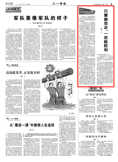 95年雄关漫道,95年军旗飘飘。千千万万革命将士矢志不渝听党话、跟党走,在挫折中愈加奋起,在困苦中勇往直前,铸就了拖不垮、打不烂、攻无不克、战无不胜的钢铁雄师。实践证明,只要跟党走,一定能胜利。正是因为有了中国共产党,有了中国共产党的坚强领导,我军前进才有方向、有力量,成为一支有政治信仰、有政治灵魂、有强大战斗力的新型人民军队。