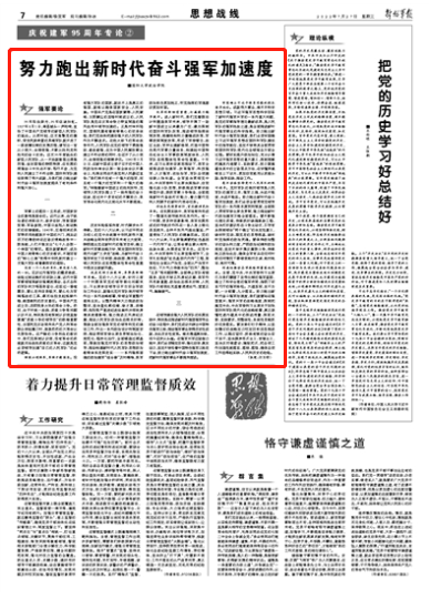 95年浴血荣光,95年征途如虹。1927年8月1日,南昌城头一声枪响,宣告了中国共产党领导的新型人民军队的诞生。从那时起,这支高擎党的旗帜、背负民族希望的英雄军队就开启了一段波澜壮阔的发展历程,谱写出一首从小到大、由弱到强、不断从胜利走向胜利的奋斗史诗。这支95年前诞生的新型人民军队,从一开始就彰显出遇强则强、奋发图强的鲜明特质,在长期的顽强奋斗中矢志不移、笃行不怠,为党和人民建立了不朽功勋,国防和军队建设取得了伟大成就,为我们努力跑出新时代奋斗强军加速度提供了有利条件和强大信心。