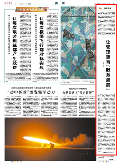 兵以治为胜,治以严为要。严密的军事组织、严明的军事纪律和严酷的军事斗争,决定了军队必须严格管理。严是必要的、必须的,但不能只有“严”,正如陈赓大将所说:“管理士兵不是冷冰冰,这样是带不出愿给你挡子弹的士兵的。”《军队基层建设纲要》在基层工作的日常管理方面明确规定,坚持严格要求同热情关心相结合,坚持纪律约束同说服教育相结合,把管理工作做得既有硬度又有温度,提高部队专业化、精细化、科学化管理水平。实践证明,只有让管理拥有直抵人心的“服务温度”,管理在战斗力建设中的质效才能得以显现,部队才能出战斗力、出凝聚力。