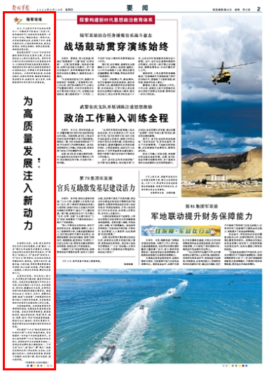 近日,习主席在中共中央政治局第四十一次集体学习时指出:“未来5年,我军建设的中心任务就是实现建军一百年奋斗目标。”推进实现这一既定目标,关系我军建设全局,发展慢了不行、质量不高更不行,必须加强创新突破,转变发展理念、创新发展模式、增强发展动能,确保高质量发展。