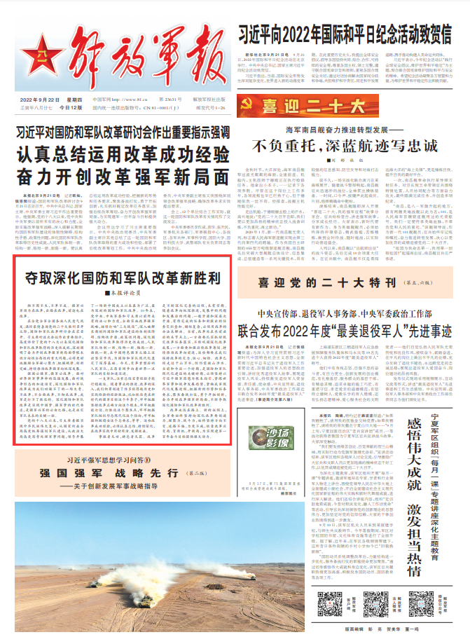 在全党全军全国各族人民意气风发、满怀豪情喜迎党的二十大胜利召开之际,国防和军队改革研讨会在京召开。习主席对这次会议作出重要指示,高度评价了党的十八大以来深化国防和军队改革取得的历史性成就,深刻阐明了奋力开创改革强军新局面带根本性方向性全局性的重大问题,必将更好地激励全军凝心聚力、把握规律、创新突破,持续推动改革强军向纵深发展。