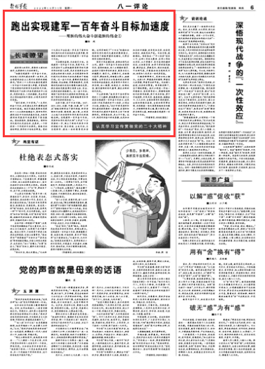 “如期实现建军一百年奋斗目标,加快把人民军队建成世界一流军队,是全面建设社会主义现代化国家的战略要求。”党的二十大作出如期实现建军一百年奋斗目标的重大部署,丰富拓展了党在新时代的强军目标的时代内涵,鲜明标定了未来5年我军建设的中心任务,是党的意志、人民的期盼,是全军官兵必须扛起的时代重任、必须交出的历史答卷。