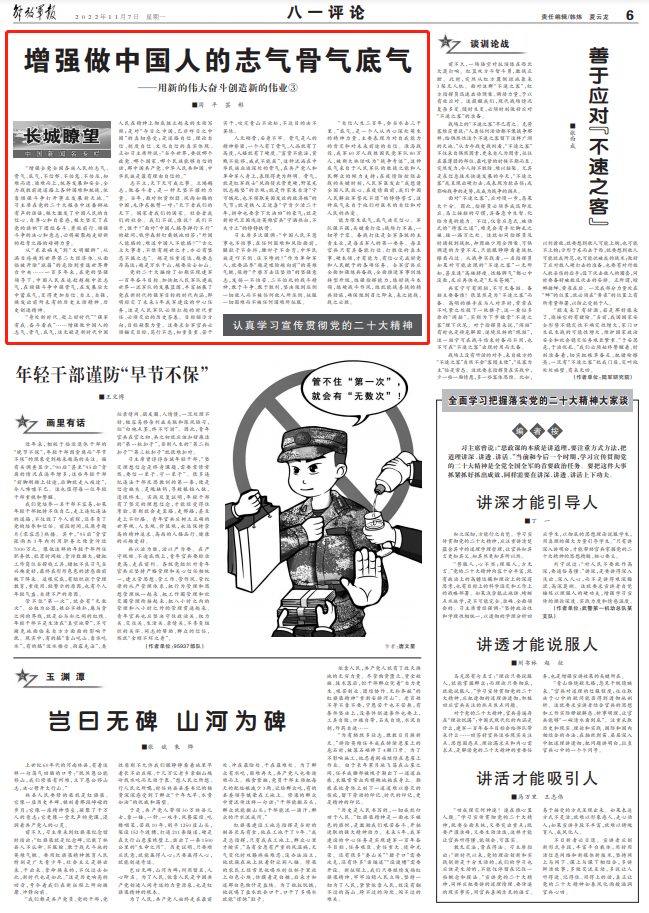 人无刚骨,安身不牢。骨气是人的精神脊梁,一个人有了骨气,人品就有了高度,人格就有了硬度。“富贵不能淫,贫贱不能移,威武不能屈”,这种流淌在中华民族血液深处的骨气,在共产党人和革命军人身上,表现得更为鲜明。骨气,就是红军战士“风雨侵衣骨更硬,野菜充饥志越坚”的乐观;就是作家朱自清“宁可饿死,也不领取美国发放的救济粮”的气节;就是铁人王进喜“宁肯少活二十年,拼命也要拿下大油田”的豪气;就是新时代卫国戍边英雄官兵“宁洒热血,不失寸土”的铮铮铁骨。
