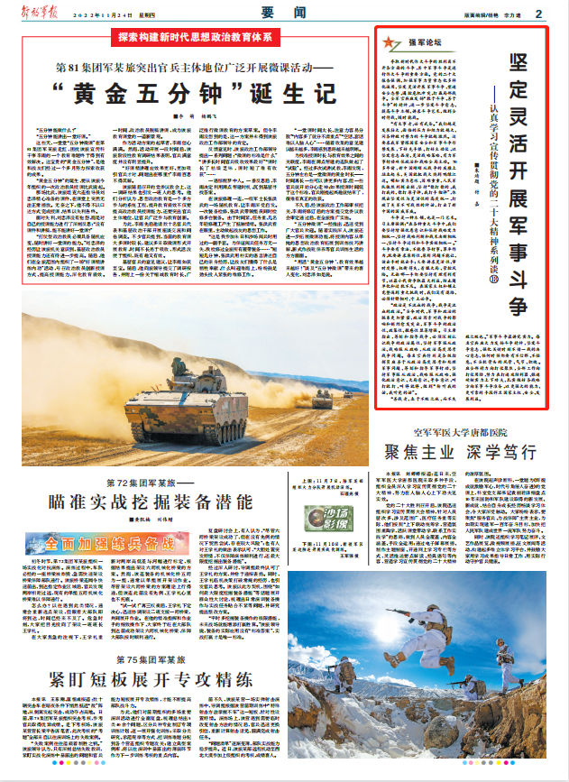 夺取新时代伟大斗争的胜利离不开各方面的斗争,其中军事斗争是进行伟大斗争的重要方面。党的二十大报告强调,加强军事力量常态化多样化运用,坚定灵活开展军事斗争,塑造安全态势,遏控危机冲突,打赢局部战争。全军官兵应发扬“敢于斗争、善于斗争”的精神,进一步坚定斗争意志、提高斗争本领、讲求斗争艺术,做到全时待战、随时能战。