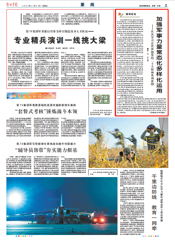 军队因战争而存在,其根本属性是打仗和准备打仗。习主席在党的二十大报告中强调,加强军事力量常态化多样化运用。这就要求我们着眼有效履行新时代人民军队使命任务,调整优化军事战略布局,运筹和平时期军事力量运用,大力推进练兵用兵一体化、兵力运用常态化,有效保持战略竞争主动,坚定维护战略全局稳定。