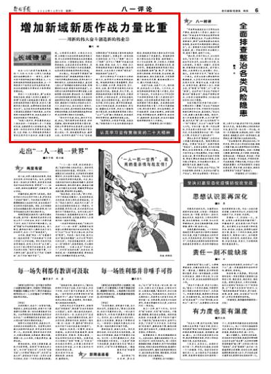 “来而不可失者,时也;蹈而不可失者,机也。”现代战争打的是体系、拼的是精锐,增加新域新质作战力量比重,是抢占军事竞争和未来战争主动的重要一手。谁能在新域新质作战力量发展上领先一步,谁就能抢得先机、赢得主动。我军军队建设“十四五”总体规划鲜明提出“布局战略力量和新域新质作战力量建设”。放眼全军一场场实战化演训活动,水下无人“鱼群”、陆上无人“狼群”、空中无人“蜂群”开始真正涌现,陆航、特战、电抗、无人、网络、空天等新域新质作战力量深度融入联合作战体系,正成为战斗力新的“增长极”、制胜战场的“台柱子”。