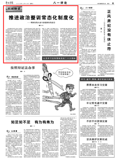 党的二十大报告强调,“推进政治整训常态化制度化”。这一重要论述,一以贯之地坚持思想建党、政治建军原则,深刻汲取新时代人民军队实现整体性革命性重塑、重整行装再出发的宝贵经验,郑重宣示了我们党全面加强人民军队党的建设、确保枪杆子永远听党指挥的坚定决心和鲜明导向。