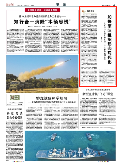 先进的组织形态,是发挥人与武器整体优势的倍增器。没有军队组织形态现代化,就没有国防和军队现代化。党的二十大报告中对加快军队组织形态现代化提出要求,这对于破解我军体制性障碍、结构性矛盾、政策性问题,对于如期实现建军一百年奋斗目标,都具有重大意义。