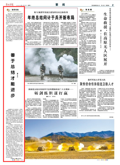 知其所来,才能明其将往。每名官兵特别是领导干部应把善于总结看作一种责任、当成一种习惯、化为一种能力。年终总结时,应对一年来的工作进行一番去粗取精、去伪存真,由此及彼、由表及里的思想加工,进一步理清思路、改进措施、提高质效。善于瞄着问题去、追着问题走,把症结查找准、把原因分析透、把措施订具体,把工作总结的过程变成谋篇布局、扬帆再出发的过程。