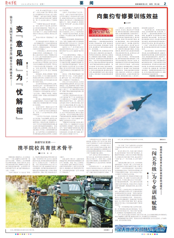 工贵其久,业贵其专。随着部队合成化、专业化、联合化水平不断提高,训练专业越来越多、课目划分越来越细,如果分散搞训练,仅凭各单位一己之力很难训全训实训到位。推行集约专修有助于挖掘资源潜力、提升训练质效,有助于纠治训练中偏训、漏训、弱训的顽症。然而,集约专修在推行过程中出现了一些问题:有的单位对“为什么集、集什么、怎么集”知之不深,生搬硬套搞集约,穿靴戴帽“贴标签”;有的单位靶向虚不精准、计划乱缺统筹;有的单位担心把最好的教练员和训练资源拿出来,会影响自己单位的成绩,共享的热情不高。