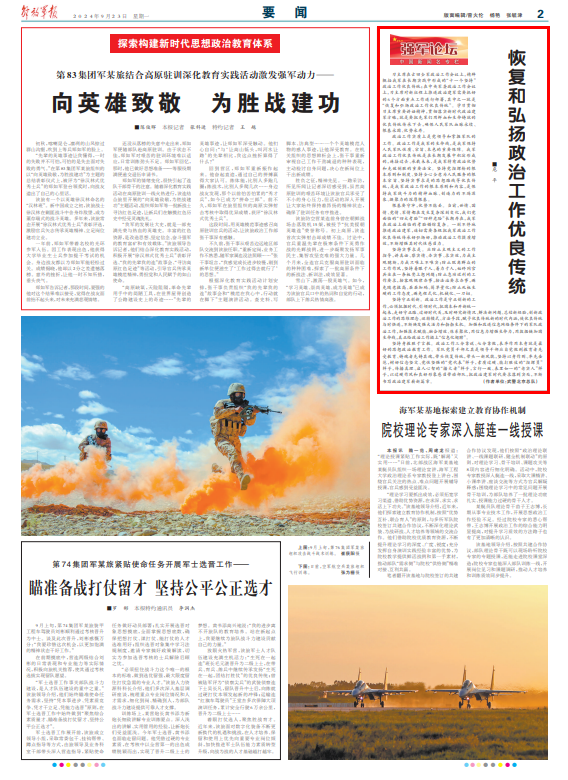习主席在古田全军政治工作会议上,精辟概括我军在长期实践中形成的“十一个坚持”政治工作优良传统;在中央军委政治工作会议上,习主席对新征程上推进政治建军需要抓好的6个方面重点工作进行部署,其中之一就是“恢复和弘扬政治工作优良传统”。学习贯彻习主席重要讲话精神,贯彻落实新时代政治建军方略,就是要把先辈们用鲜血和生命铸就的优良传统传承下去,确保人民军队血脉永续、根基永固、优势永存。