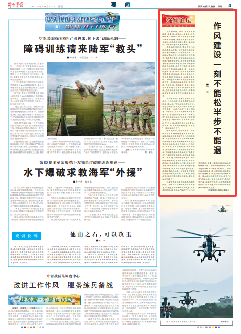作风是形象,也是战斗力。作风优良是我军的鲜明特色和政治优势。各级应锲而不舍落实中央八项规定精神、军委十项规定及其实施细则精神,以彻底的自我革命精神推进作风建设常态化长效化,坚持内化于心、外化于行,不断提高政治判断力、政治领悟力、政治执行力,以高度的自觉共同守护、不断擦亮新时代党的建设“金色名片”。“善除害者察其本,善理疾者绝其源。”要坚持不懈抓好整改整治,对已经解决的问题,抓好巩固提高,防止反弹回潮;对正在解决的问题,加大工作力度,跟踪推进落实;对需长期整改整治的问题,建立经常性整改整治台账,确保抓常抓细抓长。特别是紧盯需要集中整治的突出问题,上下联动、持续攻坚,做到问题不解决不罢休、解决不彻底不撒手。