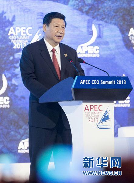 2013年10月7日,国家主席习近平在印度尼西亚巴厘岛出席亚太经合组织工商领导人峰会,并发表《深化改革开放共创美好亚太》的重要演讲。新华社记者 王晔 摄