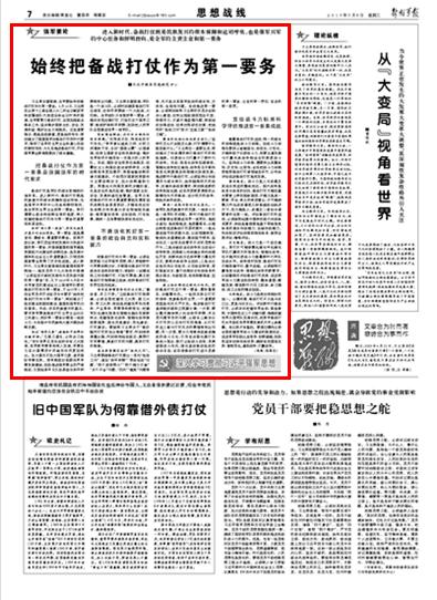今天的《解放军报》刊文指出,3月12日,习主席在出席十三届全国人大二次会议解放军和武警部队代表团全体会议时再次强调,全军要聚力备战打仗,全面加强练兵备战工作,坚决维护国家主权、安全、发展利益,维护社会大局稳定。这些重要指示,既是殷殷期望,更是统帅号令,深刻揭示了强国强军对备战打仗的时代要求,指明了全军的主责主业和重心在战的鲜明导向,为扎实推进备战打仗、开创强军事业新局面提供了根本遵循。