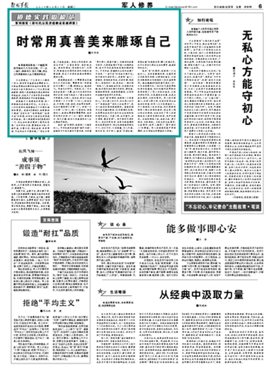 习主席指出:“广大青年人人都是一块玉,要时常用真善美来雕琢自己,不断培养高洁的操行和纯朴的情感,努力使自己成为高尚的人。”习主席的谆谆教诲,指明了道德建设的高远境界和实践途径,应成为广大青年官兵加强道德修养、提高道德水平的重要遵循。