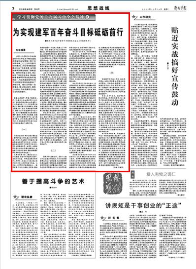 实现建军百年奋斗目标,是全党的事业、全国人民的事业,更是全体官兵的事业。目标在前,路在脚下。实现建军百年奋斗目标,要求我们必须统一思想意志,强化使命担当,狠抓工作落实,汇聚各方力量和智慧,坚定不移沿着党中央指引的方向、开辟的道路砥砺前行。