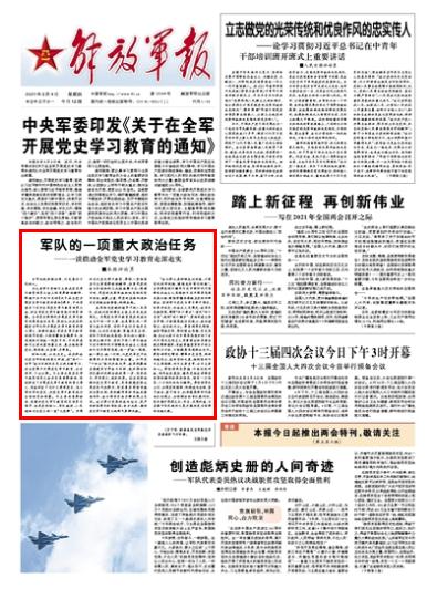 我军作为党绝对领导下的人民军队,在执行党的意志主张上历来走在前列。开展党史学习教育是党的政治生活中的一件大事,也是军队的一项重大政治任务,有利于我们总结历史经验、认识历史规律、掌握历史主动,有利于传承红色基因、牢记初心使命、坚持正确方向,有利于深入学习领会习近平新时代中国特色社会主义思想和习近平强军思想,进一步统一思想、统一意志、统一行动,从党史军史中汲取强军兴军的智慧和力量。今年是“十四五”规划开局之年,我军将聚焦实现建军百年奋斗目标,走好国防和军队现代化新征程的第一步,任务艰巨、责任重大、使命光荣。扎实有效地搞好党史学习教育,是思想建党理论强党的内在要求、向党看齐强固军魂的壮骨补钙、革命精神革命传统的赓续传承、奋斗强军开局开新的强力发动。我们要以更高的政治站位、更严的标准要求抓紧抓实、抓出成效,推动党史学习教育立起新气象新风貌。