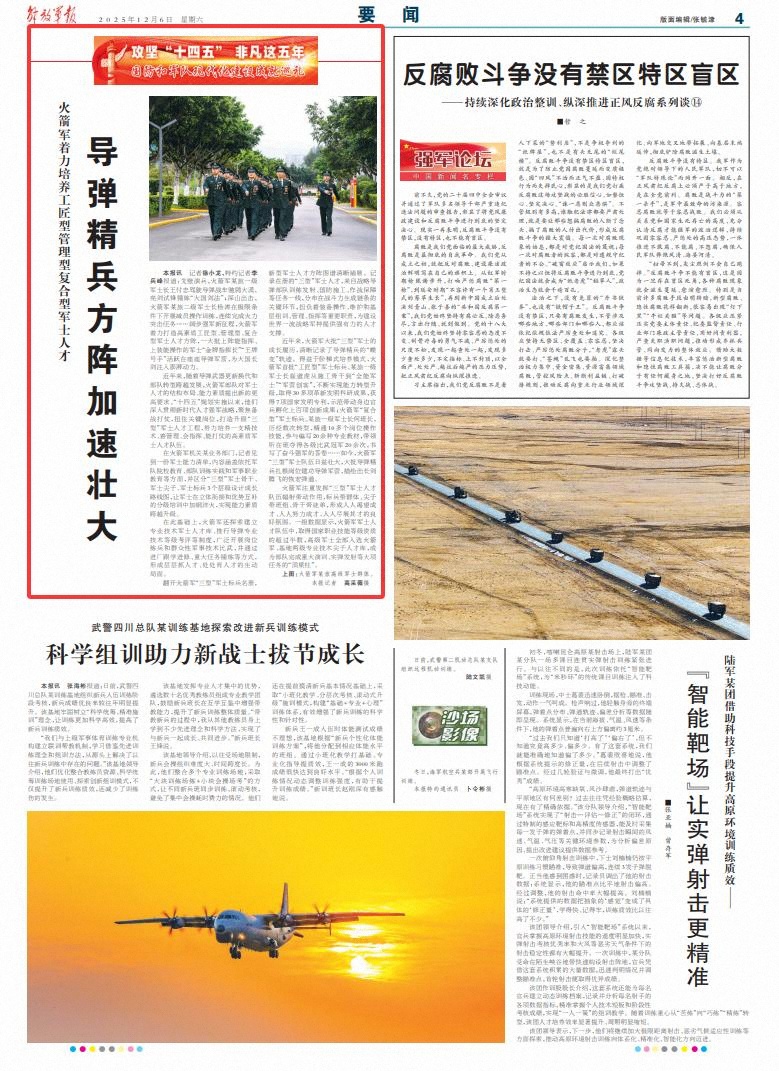 解放军报讯 记者徐小龙、特约记者李兵峰报道:戈壁演兵,火箭军某旅一级军士长王付忠驾驶导弹战车驰骋大漠,亮剑试锋锤炼“大国剑法”;深山出击,火箭军某旅二级军士长杨涛在极限条件下开展减员操作训练,连续完成火力突击任务……阔步强军新征程,火箭军着力打造高素质工匠型、管理型、复合型军士人才方阵,一大批上阵能指挥、上装能操作的军士“金牌指挥长”“王牌号手”活跃在座座导弹军营,为大国长剑注入澎湃动力。