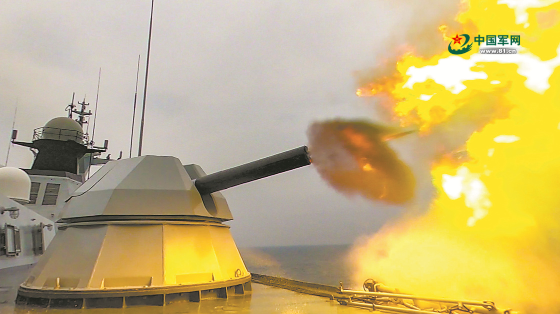 空中硝烟未散,海面“敌”情又至。编队迅速变换战斗队形、调整航向,持续追踪并锁定目标。“开火!”战斗命令下达,炮弹呼啸而出,海面腾起数米高的水柱,“敌”目标随即消失在炮火中。
