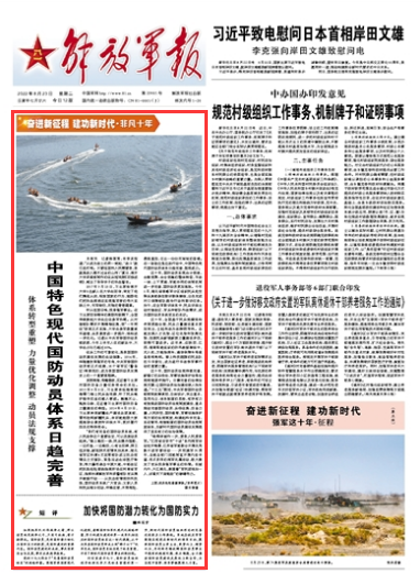 “我们有完备的国防动员系统,有人民战争这个重要法宝,可以迅速动员起来。”海上维权一线,民兵操舟驾船,一边打鱼、一边维权,心有主权碑,捍卫祖宗海;新冠肺炎疫情突如其来,湖北省军区协调6支驻鄂部队成立抗击疫情运力支援队,紧急运送生活医疗物资;特大暴雨袭击中原大地,中部战区把抗洪抢险前线指挥所设在河南省军区,指挥协调解放军和武警部队官兵展开救援行动……从抗击疫情到防汛抗洪,国防动员系统广大官兵、文职人员和民兵闻令而动、冲锋在前,不畏艰险、勇挑重担,交出一份份沉甸甸的答卷。在一场场应急应战行动中,中国特色现代国防动员体系日趋完善、显现威力。