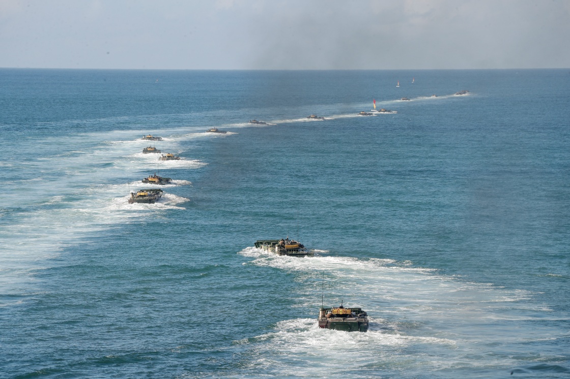 陆军第74集团军某合成旅两栖装甲车进行海上泛水编波训练(2020年8月14日摄)。新华社发(李彬 摄)