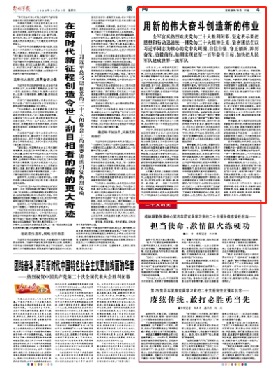 10月22日上午,中国共产党第二十次全国代表大会胜利闭幕。喜讯传来,全军官兵欢欣鼓舞、信心满怀,坚定表示要把思想和行动迅速统一到党的二十大精神上来,紧密团结在以习近平同志为核心的党中央周围,牢记空谈误国、实干兴邦,坚定信心、同心同德,埋头苦干、奋勇前进,为全面建设社会主义现代化国家、全面推进中华民族伟大复兴而团结奋斗。