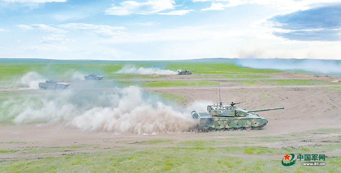 突击!突击!从空中鸟瞰,在朱日和广袤荒原上,一支钢铁纵队卷起滚滚尘烟,一路突破数道火力网、抗击多股“敌”干扰,迅猛挺进的势头锐不可当。