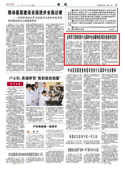 下午,宣讲团成员为联勤保障部队官兵作了权威解读和系统辅导。官兵反映,宣讲报告观点鲜明、内容丰富、重点突出,对全会提出的新理念、新思想、新战略进行了深入解读,为全面、准确、深刻理解全会精神提供了有力指导。在国防大学,宣讲团成员、军事科学院军队政治工作研究院院长沈志华从充分认识坚持和完善中国特色社会主义制度、推进国家治理体系和治理能力现代化的重大意义,坚定中国特色社会主义制度自信,准确把握总体要求、总体目标和重点任务等方面,作了深入浅出、通俗易懂的辅导报告。据介绍,该校将充分发挥自身优势,把学习贯彻全会精神作为党委中心组学习和理论培训的重点内容,组织广大教员深刻学习领会和全面准确把握全会精神,搞好理论阐释,加强宣传教育,推进建设发展,切实抓好全会精神“三进入”工作,推出一批有深度、有分量的研究成果,持续兴起学习宣传贯彻全会精神热潮。